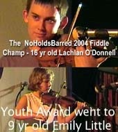 | 13) NoHoldsBarred Fiddle Contest 9 yr old Emily Little - Youth Award 17yr old Sujata Allan - Open Runner Up 16yr old Lachlan O'Donnell - Open Winner of the $2000+ Gold Epoch Violin See the Contest Details here |